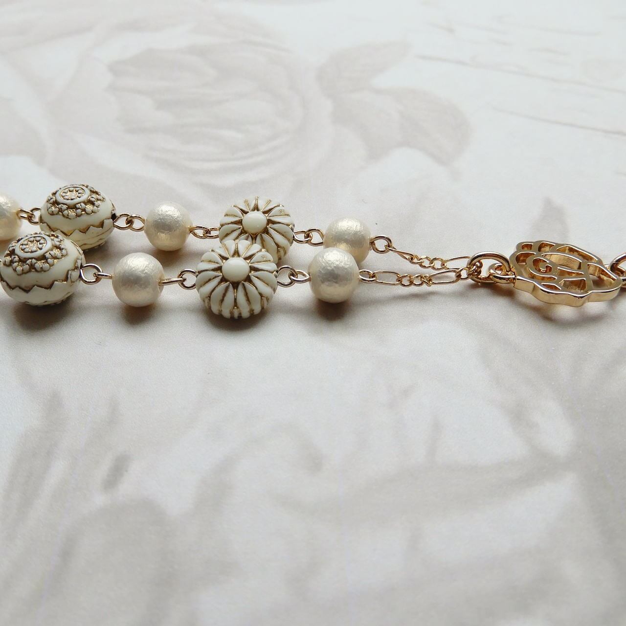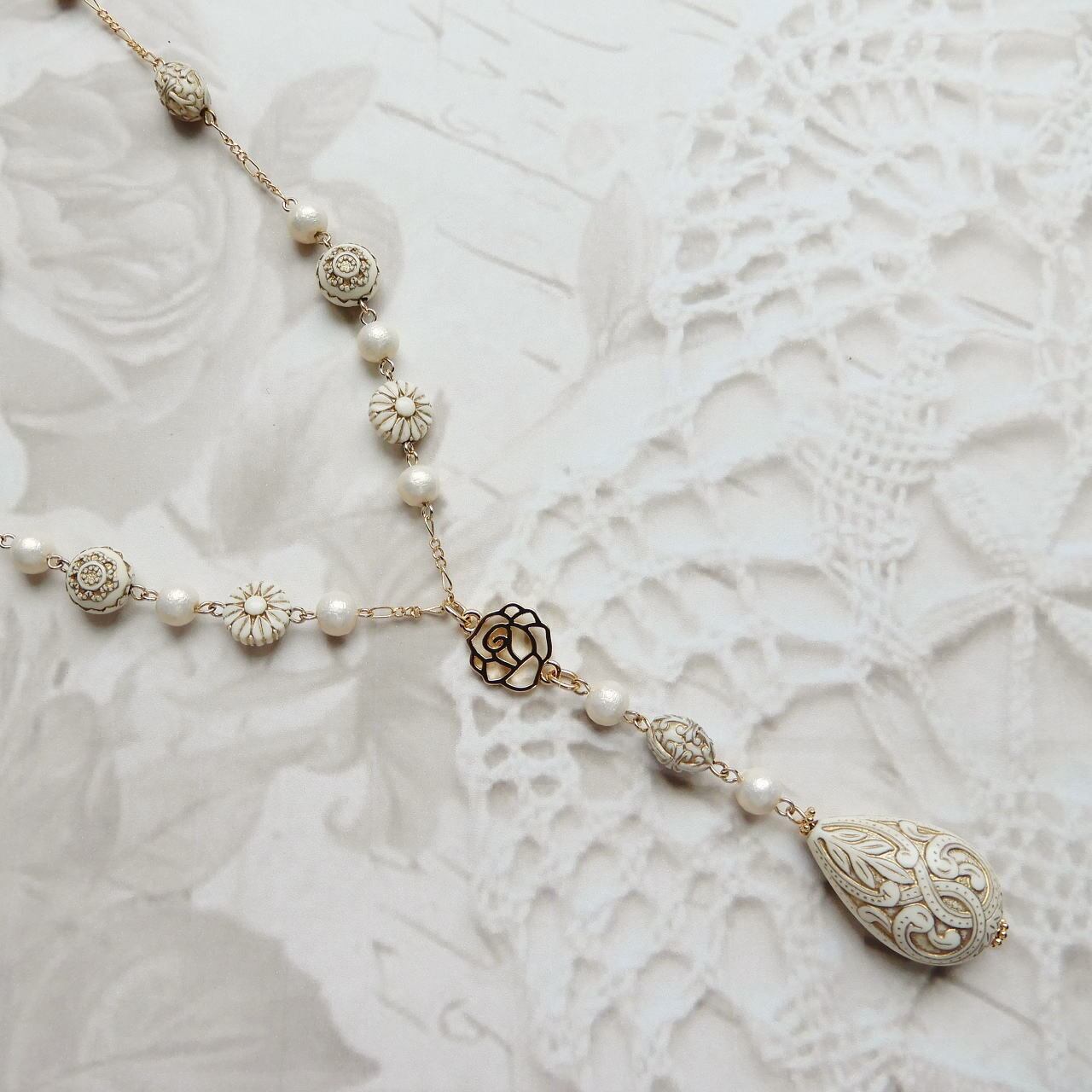 ゴールドの装飾が施されたアイボリーのしずく型とナツメ型ビーズがアンティークな雰囲気を演出しています。