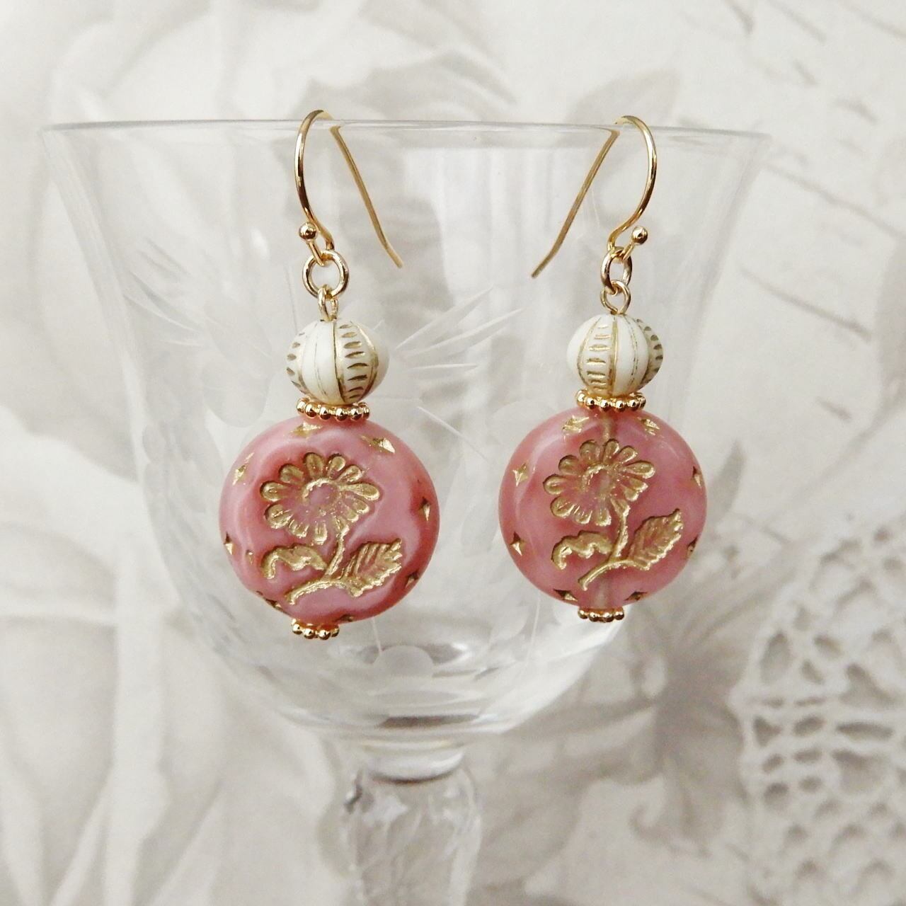 お花柄のチェコ製ガラスビーズとアンティーク風なバルーン型のドイツ製アクリルビーズのピアスです。