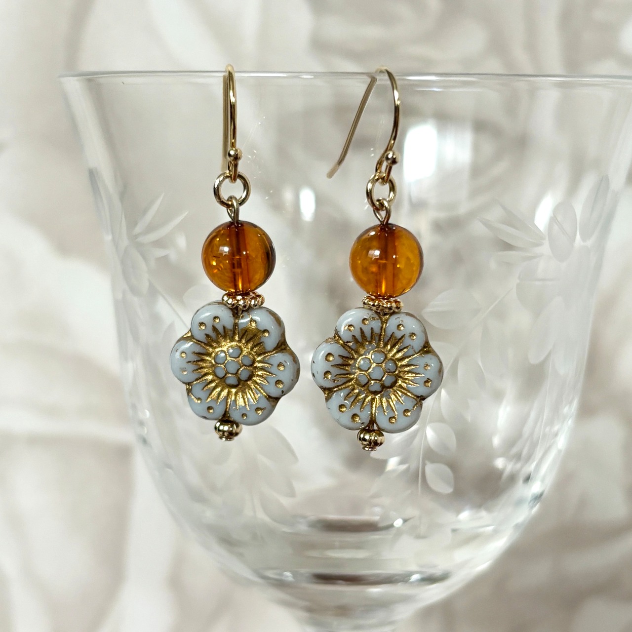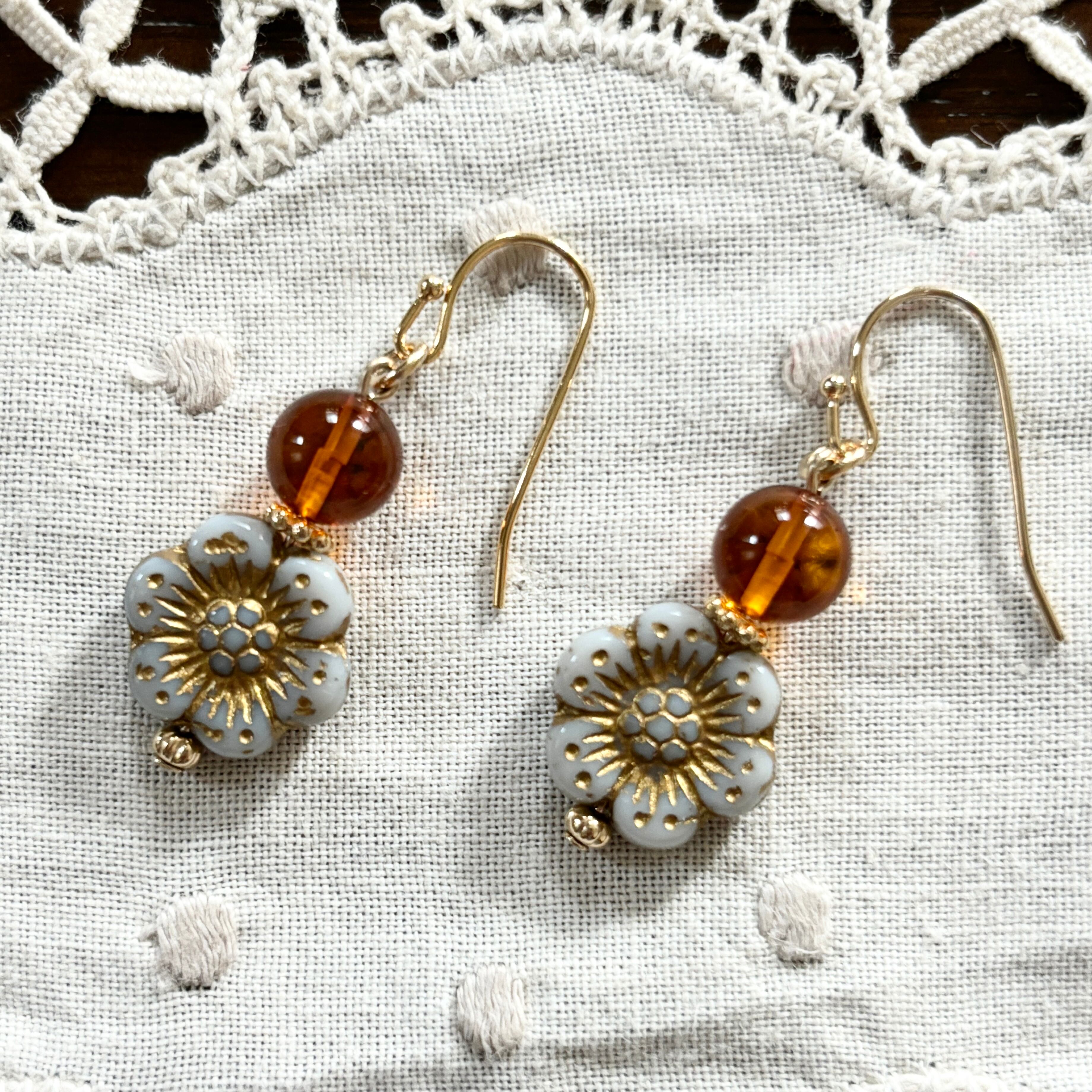 グレーのお花のチェコガラスビーズと上質なリトアニア産の天然琥珀を組み合わせて作ったアンティーク風なピアスです。